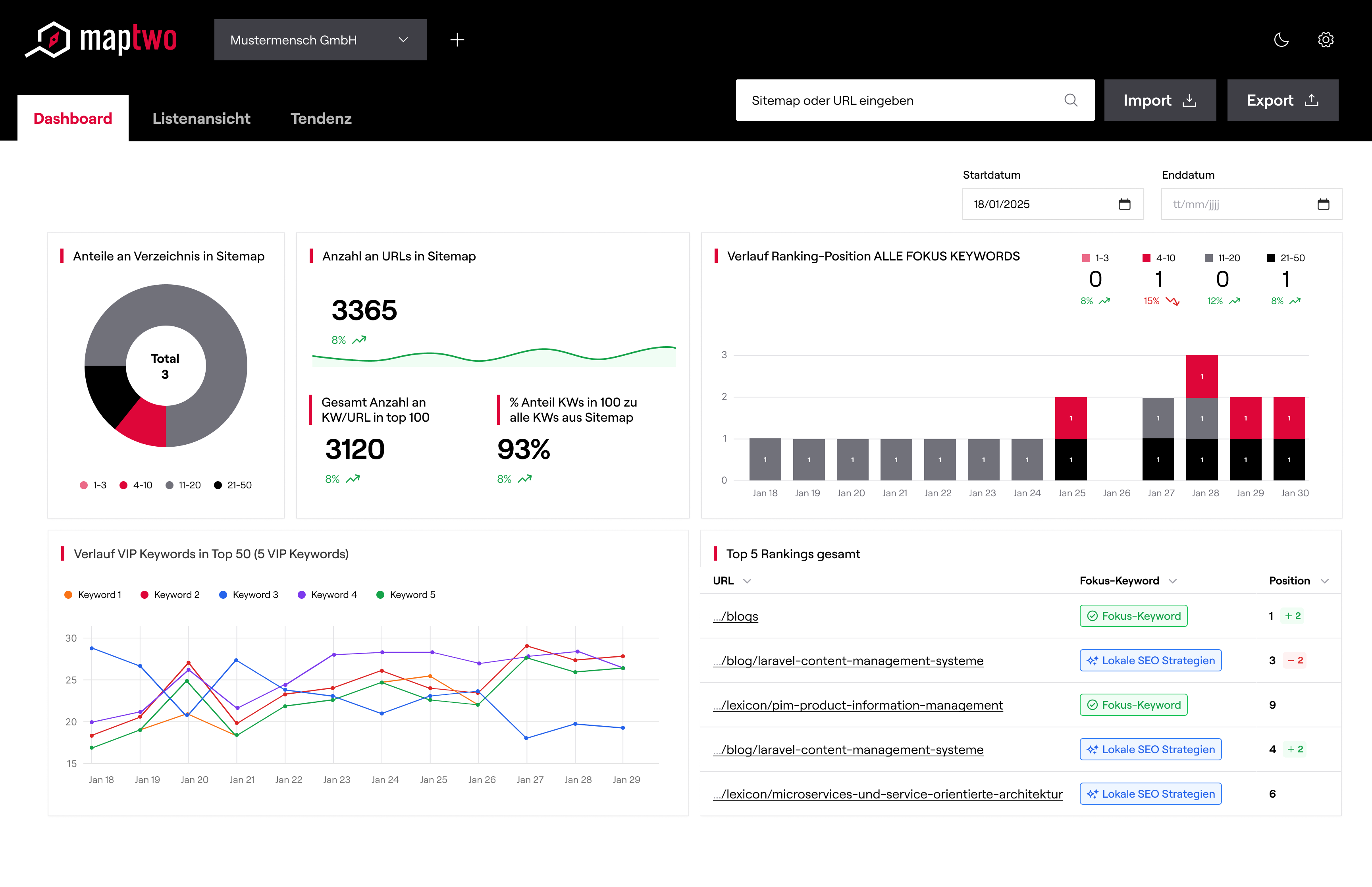 - Historical Comparison Data at the Push of a Button: Changes in rankings or visibility can be immediately recognized because the tool automatically retrieves historical data and prepares it visually.